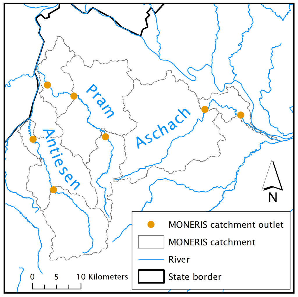 - Venohr, M.; Hirt, U.; Hofmann, J.; Gericke, A.; Wetzig, A.; Natho, S.; Neumann, F.; Hürdler, J.; Matranga, M.; Mahnkopf, J. Modelling of nutrient emissions in river systems–MONERIS–methods and background. Int. Rev. Hydrobiol. 2011, 96, 435–483. [Google Scholar] [CrossRef]