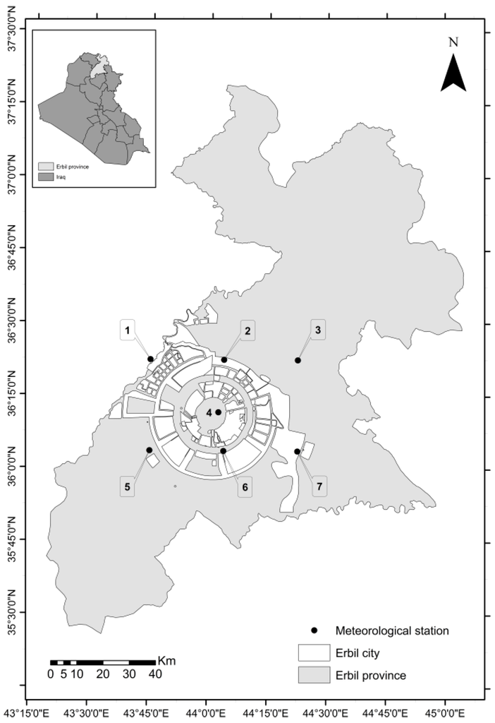 - Directorate General of Meteorology and Seismology. The Annual Weather Report for Iraqi Kurdistan Region Cities; Ministry of Communication and Transportation-KRG: Erbil, Iraq, 2016. [Google Scholar]