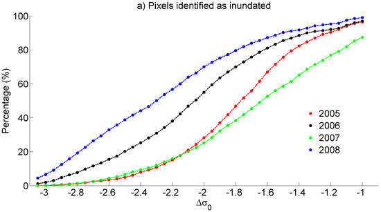 Normalized anomalies of backscattering γ were computed for the 55 ASAR images acquired during the rainy season using (7). We determined the number of pixels whose value is beyond the threshold for each rainy season from 2005 to 2008 for threshold values varying from −1 to −3 with a step of −0.05. These pixels are then considered as flooded and can be used to estimate annual maps of inundation when stacking the binary images of floods during each year’s rainy season. The range of the threshold values corresponds to intervals of confidence varying from 68.3% to 99.7% compared to its value during the dry season, according to the three-sigma rule of thumb assuming a normal distribution of the data.