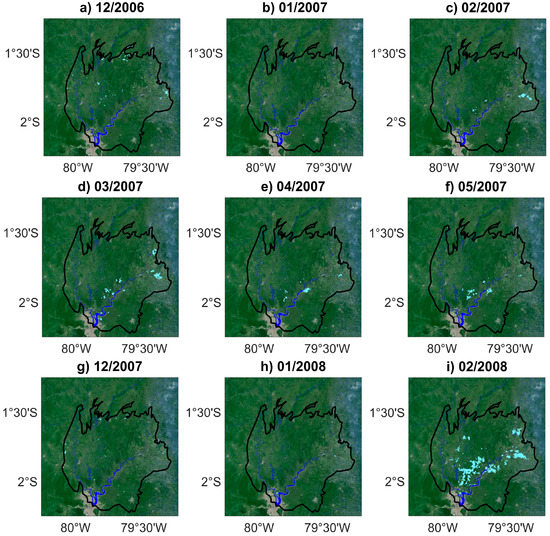 Monthly maps of inundation for normalized anomalies of backscattering coefficients lower than −2.30 (light blue) in the Guayas floodplain (black line) during the wet seasons of 2005 and 2006 (a–f) from December 2006 to May 2007; and (g–l) from December 2007 to May 2008. Background image is from Google Maps. Permanent water bodies appear in blue.