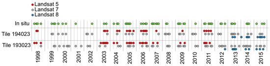 Figure 5). Since 2012, Landsat 7 and Landsat 8 are operating together providing a doubled repetition rate of eight days. However, cloud coverage still reduces the coverage significantly. For example, in 2012 the monitoring of the lakes in the Klocksin Lake Chain is only very irregular, because of the removal of cloud and cloud shadow (cf.
