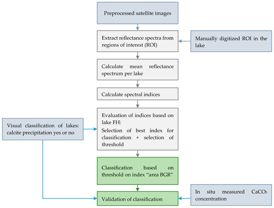 3, the lake is classified as lake with calcite precipitation. This threshold is suitable for Landsat imagery and Sentinel-2 despite their differences in bandwidth and atmospheric correction.
