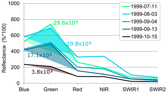 2]. Although Landsat images do not have an 800 nm band, red is on average 655 nm and NIR is at 865 nm and a comparison with the spectra of BL (