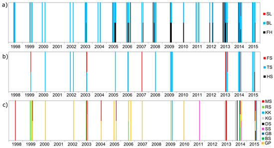 The three lakes with the most calcite precipitation events are FH, BL, and TS. Their average durations are 24, 57, and 31 days (overall average: 37 day), but all three lakes show start–stop–start–stop patterns. However, the comparison of those patterns with the visual classifications reveals that most of those short-term variations are caused by misclassifications (e.g., FN results at FH between 4 July 2014 and 13 August 2014). Visually validated start–stop–start patterns, e.g., at FH between 24 July 2013 and 26 August 2013, substantiates the results of previous studies that showed calcite precipitation with lower calcite concentrations before and after the main event and non-steady, periodic variations [