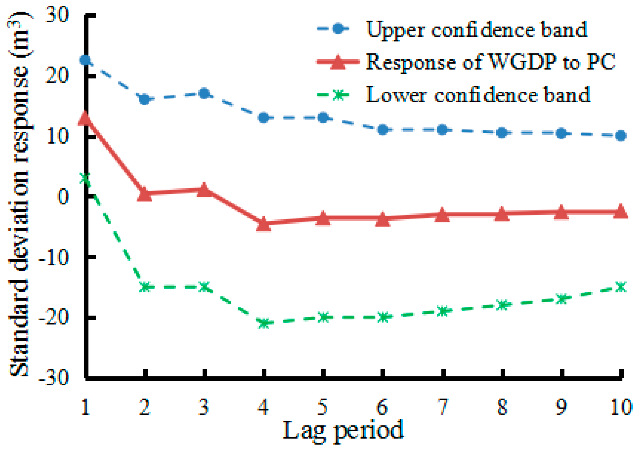 Based on the above literature illumination, the Jiangsu Province of China will be considered as the case study in this paper, and water consumption per ten thousand dollar GDP (WC/$104 GDP) indicates the comprehensive water use efficiency. Then the influencing factors of WC/$104 GDP in Jiangsu Province will be identified under the consideration of Jiangsu industrial development level and the different patterns and characteristics of agricultural, industrial and domestic water consumption. At last, we analyze the relationships between influencing factors and WC/$104 GDP for supporting government decision making. Because some influencing factors such as surface water resources (SW), groundwater resources (GW), precipitation (PT), per capita water resources (PW), per capita water consumption (PC), annual average temperature (AT), drought index (DI), per capita irrigation area (PI) and per capita arable land (PA) cannot be artificially altered, the dynamic system of these natural influencing factors need some input signals to produce the obvious fluctuation (output) to explore the subtle changes. As such, the impulse response is employed in this paper to describe the reaction of the real world system as a function of the independent variables of resource factors that parameterizes the dynamic behavior. Then the VAR model is used to generalize the univariate autoregressive model (AR model) by introducing all the resource factors to investigate their effectiveness.