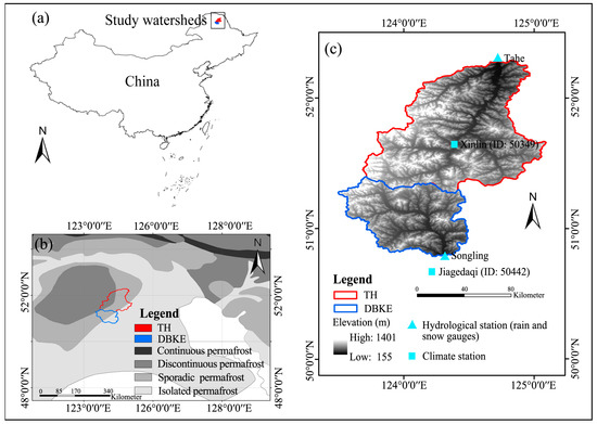 Location of the study watersheds (panels a and c) and permafrost distributions (panel b, adapted from Brown et al. [35]). TH, Tahe River watershed; DBKE, Duobukuer River watershed.