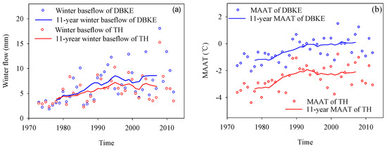 The time series cross-correlation analyses revealed that all the winter baseflows for both of the study watersheds exhibited significant and positive correlations (p < 0.05) with MAAT and thawing index over the entire study period (Table 2). Both watersheds exhibited the same lag of two years between winter baseflow and MAAT, and the same lag of four years between winter baseflow and the thawing index. The winter baseflow of DBKE also showed a significantly positive correlation (p < 0.05) with annual rainfall fraction, but no significant correlation (p > 0.05) was found between winter baseflow and annual rainfall fraction for TH (Table 2). Cross-correlation analyses were also conducted for the winter baseflows with the annul precipitation and summer rainfall. However, no significant correlations were found between them, and thus the results are not shown in Table 2.
