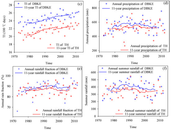 Annual and 11-year moving windows of (a) winter baseflow; (b) mean annual air temperature (MAAT); (c) thawing index (TI); (d) annual precipitation; (e) annual rainfall fraction; and (f) the summer rainfall in DBKE (blue) and TH (red). For the 11-year moving windows, the year indicated is the median year (i.e., 1990 represents the period from 1985 to 2005).