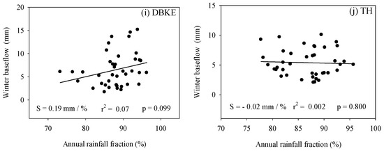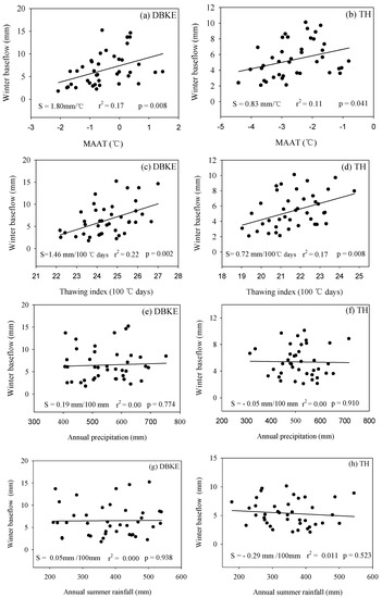 Winter baseflow vs. the MAAT (panels a and b), thawing index (panels c and d), annual precipitation (panels e and f), annual summer rainfall (panels g and h), and annual rainfall fraction (panels i and j) for the DBKE and TH watersheds. S represents the slope (the magnitude of the trend).