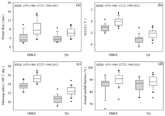 Based on the analyses above, the trend in winter baseflow was closely related to MAAT and the thawing index. To quantify changes between time periods, the entire study period was divided into two sub-periods based on the breakpoints: 1973 to 1989 (warming period) and 1990 to 2012 (stable period). Similar increases in average MAAT (0.95 and 0.79 °C) and the thawing index (164 and 172 °C days) were found between the warming period and the stable period for both DBKE and TH (Figure 5b,c), but there was a higher increase in the average annual rainfall fraction in DBKE (4.2%) than in TH (2.3%) between these two periods (Figure 5d). The average winter baseflow for DBKE also exhibited a higher increase (101%) than that for TH (65%) (Figure 5a), and these findings are consistent with the results of the trend analyses which determined the total changes over the period of record to be 67% (TH) and 98% (DBKE) (Table 1).