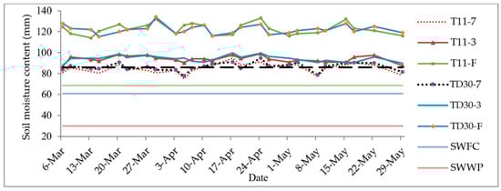 | Treatments | Irrigation Water (m3/ha) | Rain Water (m3/ha) | Irrigation Water Productivity (kg/m3) | Total Water Productivity (kg/m3) |
