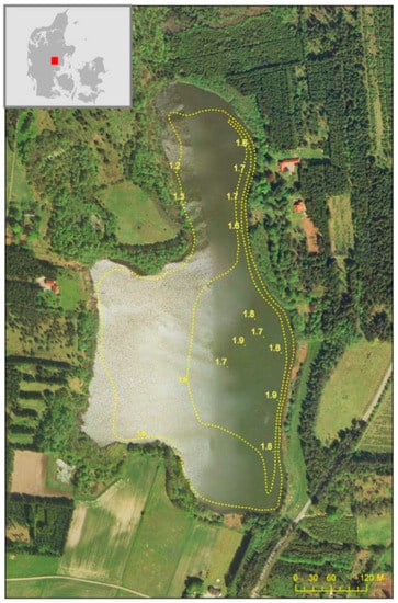 From 1964, the lake received wastewater from a small village, but this was diverted in 1981, projected to reduce the external phosphorus loading from 4 to 1.5 g·P·m−2·year−1 [2]. However, the lake remained eutrophic with a mean summer Secchi depth of 0.6–0.8 m (1981–1986), chlorophyll a concentrations of 76 μg·L−1 (1986) and dominance of cyanobacteria [20]. No known changes have occurred in the external nutrient loading since 1981. Lake Væng and topics related to its restoration have previously been described in various papers [6,21,22,23,24].