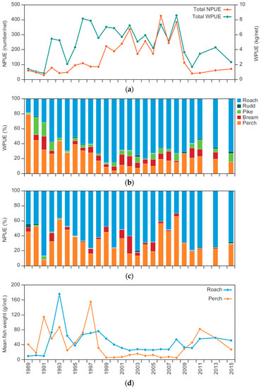Fish stock composition and relative biomass were investigated with standardised methods every year from 1989 to 2011 and every second year from 2011 to 2015. The fish monitoring was conducted from 15 August to 15 September using eight to twelve 42 m long multiple mesh-sized gill nets with 14 different mesh sizes ranging from 6.25 mm to 75 mm [25,26]. The nets were set in different parts of the lake in late afternoon and retrieved after 18 hours. Except for unharmed large pike, fish caught during the monitoring were not released into the lake again. Quantitative measurements of the total fish stock and the individual species were expressed as catch per unit effort of weight (WPUE) or numbers (NPUE). It should be noted that bream is not easily caught in these survey nets and its relative abundance may have been underestimated.