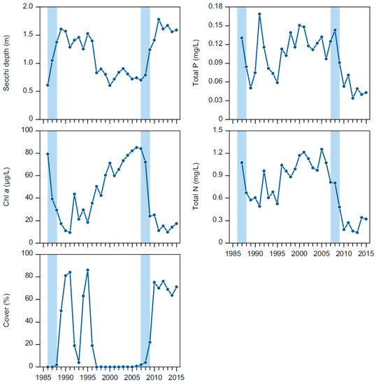 Summer means of Secchi depth, CHL and nutrient concentrations were highly variable during the 30 years of monitoring (Figure 3). After the first biomanipulation, Secchi depth increased from 0.6 m to 1.3–1.6 m from 1988 to 1996 but then declined to 0.6–0.8 m during the following 10 years. After the second biomanipulation (2010–2015), Secchi depth increased to above 1.5 m or the maximum depth of the lake. CHL varied correspondingly, with high concentrations (60–80 μg·L−1) before the two biomanipulations and low concentrations (10–30 μg·L−1) for a period after the two biomanipulations. CHL increased steadily from a minimum in 1991 (9.4 μg·L−1) to a maximum before the second biomanipulation of 85 μg·L−1 in 2006. Secchi depth was significantly higher and CHL significantly lower in periods with high Cov than in periods with low Cov (Table 3).