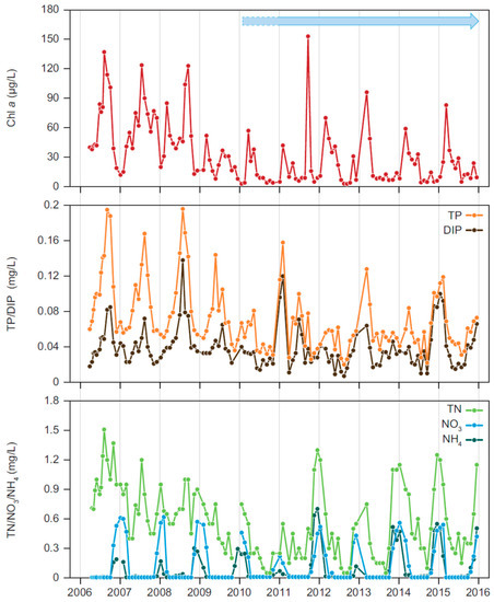 Seasonal variations in CHL, TP, DIP, TN, NO3 and NH4, during the past 10 years. The blue arrow denotes occurrence of high macrophyte cover.