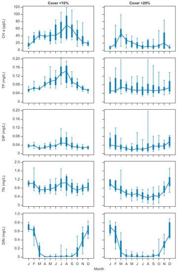 A box-plot representing the monthly average for the whole monitoring period (1986–2015) with either low or high Cov illustrates the seasonal differences in CHL and nutrients between turbid and clear periods (Figure 6). The results of a test of the differences between low and high Cov during the different months are shown in Table 6. At low Cov, maximum CHL generally occurred in August, and when Cov was high it usually peaked in March. CHL was significantly lower at high Cov than at low Cov from April to October. TP concentrations were markedly higher during summer, peaking in July–August, but only when Cov was low. From April to July and in September, TP was significantly lower at high Cov than at low Cov. Maximum TN tended to appear during summer when Cov was low and in winter when Cov was high. TN was significantly lower at high Cov than at low Cov from April to September. DIN was low during the whole summer season, from April to September at all Cov levels.