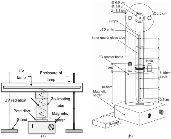 (a) Reactor type of 10 mL for Hg-UV in collimator; (b) Reactor type of 5.2 L for UV-LED with four LEDs at three different heights inside the water.