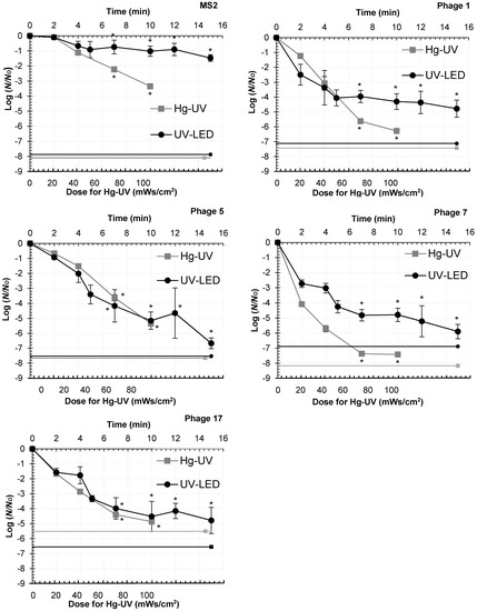 Inactivation of MS2 and four UV- and/or Cl-resistant coliphages (1, 5, 7 and 17) with Hg-UV and UV-LED treatment. Statistically significant differences from the control (UV dose 0 mWs/cm2), assessed by related sample Friedman’s two-way analysis of variance, are indicated with asterisks, * p < 0.05. The lines show the theoretical maximal Log10-reductions for each coliphage. For