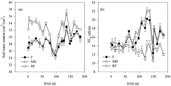 Temporal dynamics of (a) soil water content and (b) ECe under the mulch in 0–80 cm layer for flat (F), mini-ditch (MD), and ridge-furrow (RF) planting during the cotton growth period. DAS means days after sowing. Values are mean ± standard error (n = 3).