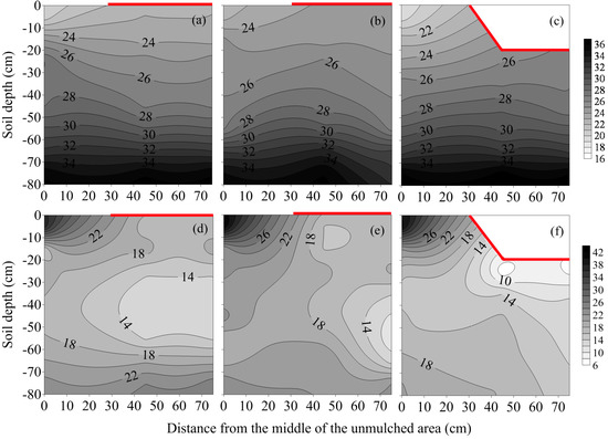 Spatial distributions of (a–c) soil water content (cm3/cm3) and (d–f) ECe (electrical conductivity of soil paste extract) (dS/m) in 0–80 cm layer at 97 DAS (boll-setting stage). (a,d) flat (F); (b,e) mini-ditch (MD); and (c,f) ridge-furrow (RF) planting. DAS means days after sowing. Red lines represent plastic film.