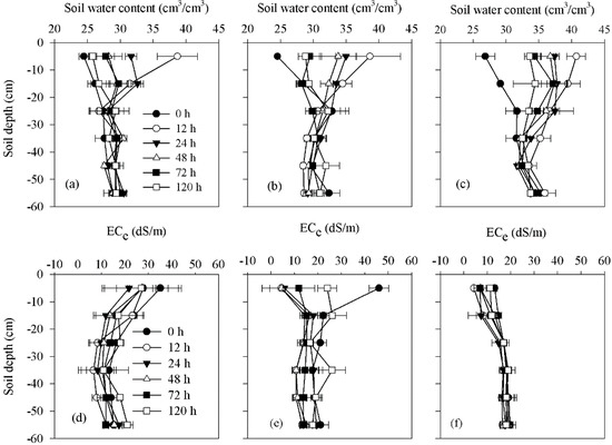 Distributions of (a–c) soil water content and (d–f) ECe in 0–60 cm layer beneath the emitter before (0 h) and after (12 h, 24 h, 48 h, 72 h, 120 h) drip irrigation at 54 DAS (squaring stage). (a,d) flat (F); (b,e) mini-ditch (MD); and (c,f) ridge-furrow (RF) planting. DAS means days after sowing. Values are mean ± standard error (n = 3).