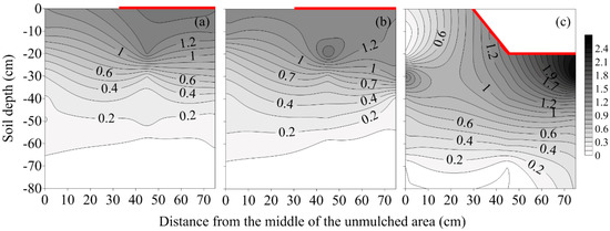Spatial distribution of soil water content showed an increasing trend with the increase of soil depth during the driest period for the three planting patterns (Figure 2a–c). Soil water content in the whole profile of RF was the highest (26.5%), and was 3.0% and 2.0% higher than that of F and MD, respectively. Moreover, soil water content of the 20–80 cm layer under the RF mulched was 11.4% higher than that of the unmulched area, while smaller differences were found for F (−3.1%) and MD (0.7%). The infiltration depth of F, MD, and RF was 30 cm, 30 cm, and 50 cm, respectively at 12 h after drip irrigation (Figure 3a–c). Soil water content of RF in the 0–30 cm layer was 5.1% and 5.0% higher at 120 h after drip irrigation than at 0 h (before drip irrigation) for F and MD, and soil water content in the 20–50 cm layer was 15.8% higher at 120 h after drip irrigation than at 0 h for RF.
