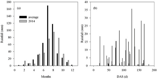 (a) Monthly average rainfall distribution during the past 50 years (1960–2010) and in 2014; (b) Daily rainfall distribution after sowing in 2014. DAS means days after sowing.