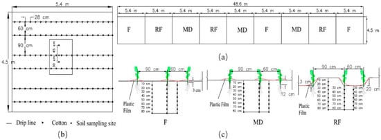 The experimental area was 218.7 m2 (4.5 m × 48.6 m) in total, divided into three blocks with an area of 72.9 m2 (4.5 m × 16.2 m), and there were three replications in a randomized block arrangement (Figure 6a). Each block accommodated three plots (4.5 m × 5.4 m), which were F, MD, and RF, respectively (Figure 6a). The field was plowed, harrowed, and leveled with a rotary cultivator (1GQN-230, Tongtian Co., Shijiazhuang, China) in preparation for planting 10 days before sowing. Cotton (Gossypium hirsutum L.) cv ‘Jiza No. 1’ was chosen as the tested cultivar and is widely planted in the experimental area. Cotton was sown on 22 April and harvested on 23 October in 2014.