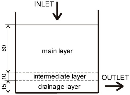 This section shows simulation results for VF wetlands using the HYDRUS Wetland Module. Simulations have been carried out for a VF pilot-scale wetland (Figure 1) operated in the technical laboratory hall of the Institute of Sanitary Engineering at BOKU University in Vienna, Austria []. The systems had a 60 cm main layer consisted of sand with a grain size of 0.06–4 mm (d10 = 0.2 mm; d60 = 0.8 mm) and a surface area of 1 m2. The intermediate layer (gravel 4–8 mm) prevents fine particles from being washed out into the drainage layer (gravel 16–32 mm). The systems were loaded four times per day with mechanically pre-treated municipal wastewater (each loading 10 L) and were planted with giant cane (Arundo donax).