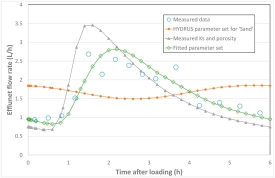 Measured and simulated effluent flow rates of the VF pilot-scale wetland for a single loading of 10 L (“HYDRUS parameter set or ‘Sand’”, “Measured Ks and porosity” and “Fitted parameter set” represent the parameter sets from Table 3).