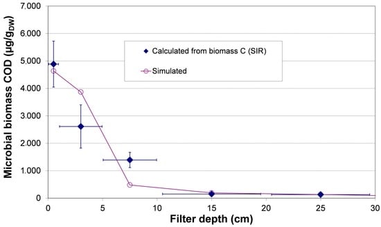 Calculated and simulated microbial biomass COD (Chemical Oxygen Demand) in different depths of the main layer of the VF pilot-scale wetland (adapted from [,]).