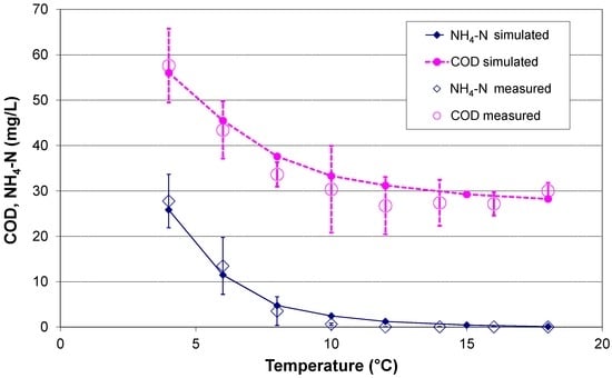 Measured and simulated effluent flow rate and cumulative effluent of the experimental wetland showed good match []. Using the calibrated water flow model and using the original CW2D parameter set [], measured effluent concentrations during summer could be simulated. However, at lower temperatures, measured COD and NH4-N effluent concentrations could not be simulated because hydrolysis and nitrification at low temperatures were over predicted. The standard CW2D parameter set considers temperature dependencies only for maximum growth, decay and hydrolysis rates. Using a modified parameter set (that includes temperature dependencies for the half-saturation constants of hydrolysis and nitrification) measured and simulated COD and NH4-N effluent concentrations showed a good fit (Figure 4). With this modified parameter set, simulating the COD and NH4-N effluent concentrations at low temperatures was possible []. Temperature dependencies for the half-saturation constants of hydrolysis and nitrification are now included in the standard parameter sets of CW2D and CWM1 [].
