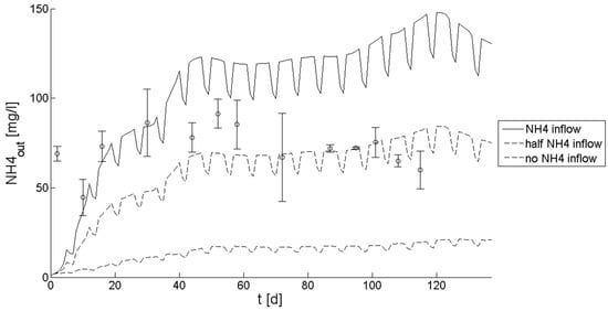 Rizzo et al. [] described the set-up of a model to simulate experimental data from a HF wetland fed with artificial wastewater. During the experiments, the only nitrogen parameter measured in influent was TKN (Total Kjehldal Nitrogen). As the model requires influent concentrations of ammonia nitrogen, the organic N content of different COD fractions had to be adapted from standard values for the type of used artificial wastewater. This results in different ratios of ammonia nitrogen to TKN. Figure 5 shows the impact of different influent concentrations of ammonia nitrogen on simulated effluent concentrations. When all influent TKN is assumed to be ammonia (i.e., no organic nitrogen is present), simulated effluent concentrations of ammonia nitrogen are higher than measured effluent concentrations. On the contrary, when all influent TKN is assumed to be organic nitrogen (i.e., no ammonia is present), simulated effluent concentrations are too low.