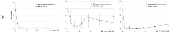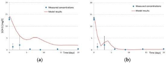 Pálfy and Langergraber [] simulated experimental results from batch-fed column experiments using the CWM1 biokinetic model. They described the need to adjust some parameters of the biokinetic model, i.e., the inhibition coefficients of acetotrophic methanogenic and sulphate reducing bacteria for dissolved oxygen and nitrate, respectively, to be able to simulate anaerobic, anoxic, and aerobic processes to occur in parallel. The local effect of root zone re-aeration can explain these phenomena. Figure 6 shows measured and simulated sulphate concentrations before (a) and after (b) the adjustment of parameters of the CWM1 biokinetic model. Batch experiments can be used to calibrate the biokinetic model parameters, as there is no impact of water flow on the treatment performance.
