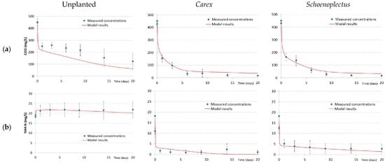 Simulation results for COD (a) NH4-N (b) and SO4-S (c) at 12 °C for unplanned columns, and columns planted with Carex and Schoenoplectus. Continuous line: simulation results, dots: measurement means, intervals: standard deviation (adapted from []).