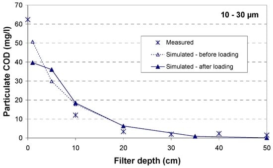 The model was tested using measurements of particle concentrations in different depths of the 50-cm main layer of the VF pilot-scale wetland as described before. Particle measurements at the inlet were used to calculate fractionation of COD influent. Measured and simulated soluble particulate COD concentrations for the 10–30 μm particle class before and after loading of the VF wetland along the filter depth are shown in Figure 8. “Measured” particulate COD was calculated from particle measurements. In general, the first test showed a good agreement between measured and simulated particulate COD. However, there is still a great need for further testing of the particle transport model and for finding an optimal parameter set for various conditions present in treatment wetlands.