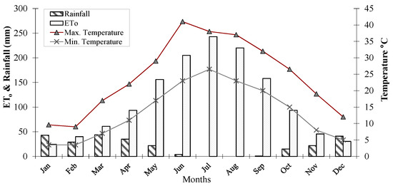 The study area was located at Ras-El-Ain (latitude 36°50’ N, longitude 40°4’ E) in the Al-Khabour basin, Al-Hassakeh region, northeast Syria. The area has a semi-arid climate, as shown in Figure 1, with low rainfall. Reference evapotranspiration (ETo), computed for a 10-year period (1993–2002) with the FAO-Penman Monteith method [39], exceeds precipitation for most of the months. The topography is slightly undulated with land elevations ranging from 165 to 325 m.