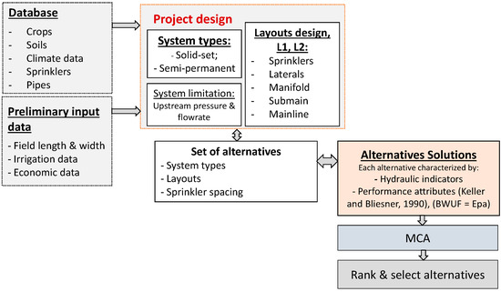 Multi-criteria analysis was selected because it combines various criteria, often contradictory, of an economic, environmental and technical nature, as well as relative to water saving. Furthermore, it admits various schemes for prioritizing and ranking the technical solutions being compared [26,27,28]. MCA adapts well to selecting fertilizing and irrigation options [29,30], to supporting improvements in irrigation management and water saving [28,31,32] or to comparing and selecting irrigation methods [24,33]. As an alternative to MCA, various methods are available to select irrigation systems through considering costs, production parameters, yields and water use [34,35,36,37]. However, the interdependency among factors and criteria is better considered using MCA, as for the examples above, or with the analytical hierarchy process used by Montazar and Behbahani [38] for irrigation system selection.