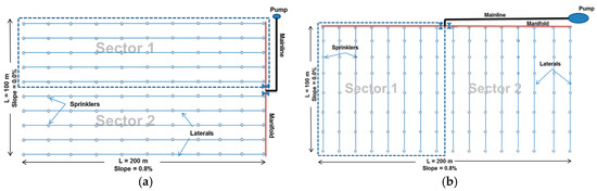 Sprinkler system alternatives were obtained by combining two pipe layouts (Figure 4), four types of sprinklers and five different spacings. The two layouts used, L1 and L2 (Figure 4), consisted of different positions of the laterals in relation to the manifolds, in both cases, dividing the field into two sectors. The sprinkler types (sp1, ..., sp4) and their characteristics, as well as the spacing tested (G1, …, G5) are reported in Table 1. The pipes adopted for the laterals and manifolds were of high-density polyethylene and for the main lines were PVC pipes. Pipe sizes were computed by the model when a target CU of 80% was given as the input. Model results include the mainline, submain, manifold and lateral pipe sizes, the pressure head and discharge of each sprinkler and their variation across the system.