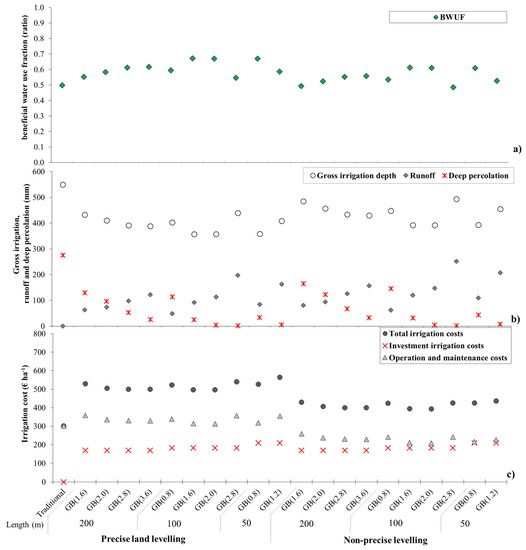 Economic results (Figure 5c) show that the investment cost, including relative to initial land levelling, varies with the borders’ length from 170 to 209 €·ha−1, with the smaller value for the 200 length. The annual cost of land levelling maintenance in case of PL alternatives is 122 €·ha−1. The labor and water costs for system operation range from 190 to 260 €·ha−1 with the highest cost for NPL alternatives since the latter require longer application time, thus more labor. Results are in agreement with those reported by Darouich et al. [23] and Rudrapur and Patil [52]. EWPR ranged from 2.3 to 2.7 for NPL and from 1.9 to 2.2 for PL alternatives. This difference is due to higher total irrigation costs associated with precise land levelling. Nevertheless, both alternatives are profitable since EWPR values are always larger than 1.0.