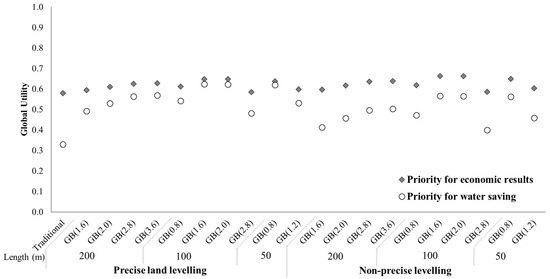 The global utilities (U) characterizing all alternatives when priorities are assigned to water saving or to farm economic returns are presented in Figure 6. Results show that when the priority is assigned to farm economics, the U values are always superior to the ones relative to water saving prioritization. Moreover, related U values for NPL alternatives are slightly larger than for precise levelling, while when water saving is considered as the priority, the U values for PL are superior. Utility values, when the priority, assigned to economic returns range from 0.58 to 0.66. As expected, traditional irrigation presents the lowest U value in terms of water saving, while for economics (U = 0.58), it is similar to those obtained for a 100-m graded border with a large flow rate of 2.8 L·s−1·m−1, for both NPL and PL.