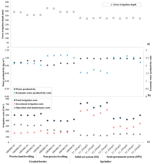 Economic input data relative to surface and sprinkler irrigation systems are presented in Table 4. Information about water, labor and yield costs, were obtained from the Ministry of Agriculture and Agrarian Reforms [47].