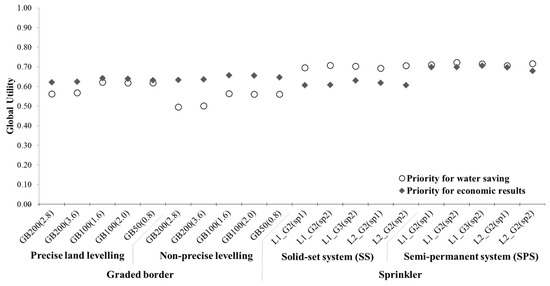 Global utilities for the best alternatives of SS and SPS are compared with those for precise and non-precise levelled GB in Figure 10. Results show that when the priority is assigned to water saving, sprinkler systems perform better than surface irrigation. The worst results were obtained for the long borders (200 m) without precise levelling. In terms of economic returns, the best results are for sprinkler-SPS alternatives, while solid sets have worse results due to high investment costs. In economic terms, GB alternatives perform similarly to solid sets.