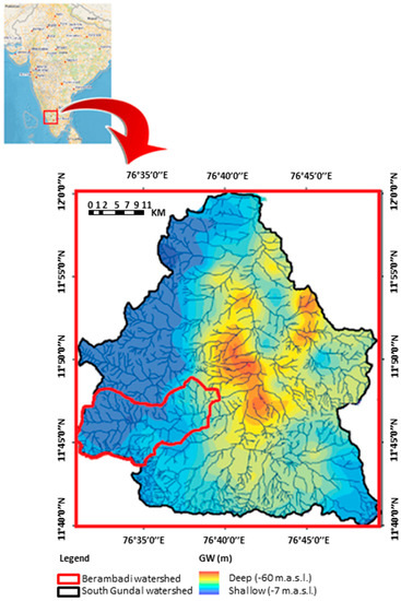 Location of the case study. The Berambadi watershed belongs to the South Gundal watershed located in southern Karnataka state. GW is the ground water level below ground (m). The GW level comes from extrapolation of data measured on 600 disused borewells at the end of 2012 monsoon.