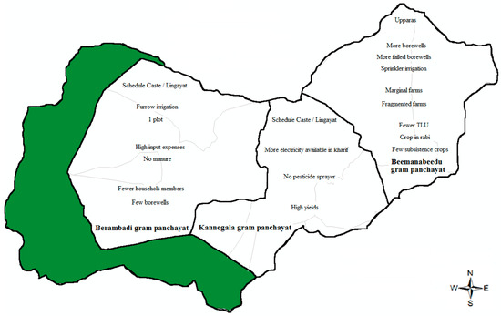 At the Berambadi watershed scale, three gram Panchayats (The Panchayat is the system of local self-government. The basic unit of the Panchayats in India is known as the “gram Panchayat” [43], namely the village council that is elected in the popular voting system. The principal functions performed by the gram Panchayats are maintaining roads, wells, schools, burning and burial grounds, sanitation, public health, libraries, reading rooms, community centers, etc.) were identified: (i) Bheemanabeedu gram panchayat for the eastern villages; (ii) Kannagala gram panchayat for the central villages and (iii) Berambadi gram panchayat for the western villages. The eastern portion of the watershed is statistically dominated by the Upparas sub-caste, and the central and western portions consist mainly of the Schedule Caste and Lingayat (Figure 2).