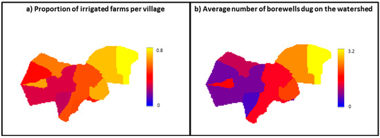 Figure 3 summarizes the spatial distribution of irrigated farms and their borewell characteristics within the watershed. Each farm has drilled approximately three borewells in the Beemanabeedu gram panchayat vs. less than one in the Berambadi gram panchayat, which is consistent with irrigated farms being located predominantly in the Beemanabeedu gram panchayat villages. However, borewell failure has occurred predominantly in the Beemanabeedu gram panchayat villages (more than 65% of borewells drilled in the Beemanabeedu gram panchayat villages have failed, vs. 53% in the Kannegala gram panchayat villages, and 35% in Berambadi gram panchayat villages), which results in a relatively uniform number of working borewells per farm within the watershed.