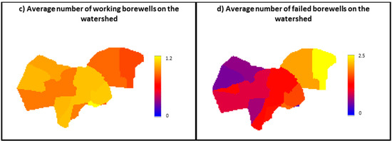 Distribution of irrigated farms and number of borewells per farm on the watershed. The maps present for the 12 villages (a) the distribution of irrigated farms; (b) the average number of borewells drilled per farm; (c) the average number of working borewells per farm and (d) the average number of failed borewells per farm.