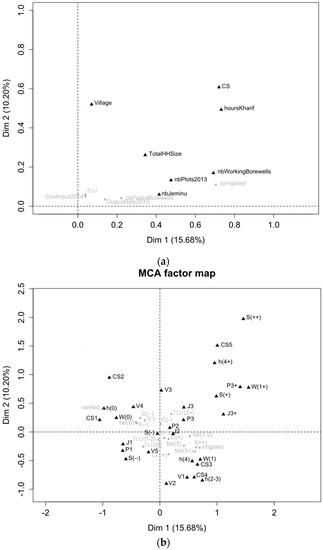 The first two components of the MCA explain 25.9% of the total variability in individuals (Figure 4). The third and fourth components explain 8.1% and 7.1% of the total variability in individuals, respectively. The first axis discriminates (1) rainfed farms that grow rainfed crops without access to irrigation water and (2) irrigated farms that grow mixed crops based on irrigation water from borewells and access to electricity (Figure 4). The second axis discriminates (1) large farms (S(+)) with several jeminus (J3+) and several plots that use water from borewells located in the center of the watershed (V3 and V4), where electricity is more available (hours(4+)) and that grow irrigated and rainfed crops for cash and subsistence purposes (CS5 and CS2) from (2) smaller farms (S(-) and S(--)) located in the eastern and western portions of the watershed (V1, V2 and V5) that grow crops on one or two plots (J1 and J2) as a cash crop (CS4 and CS3) and have less available electricity (hours(2–3) and hours(4)).