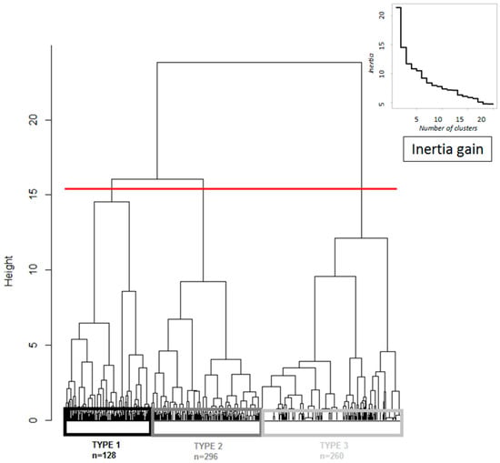 Dendrogram of individuals from Agglomerative Hierarchical Clustering performed on the first 12 components of the Multiple Correspondence Analysis. Type 1 are large, diversified and productivist farms. Type 2 are small, marginal rainfed farms. Type 3 are small, irrigable marketing farms. Using the first 12 principal components in an Agglomerative Hierarchical Clustering (AHC) algorithm, we obtained a typology with three farm types (red line). Jump in between-cluster inertia is represented in the right corner.