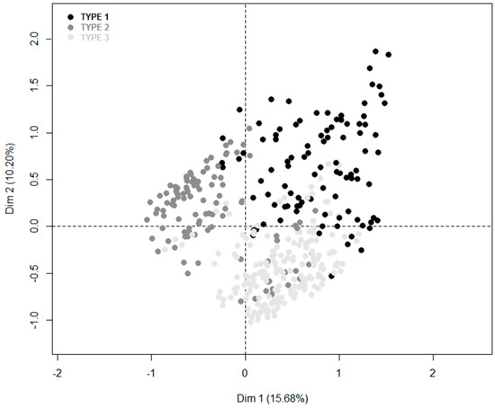 The MCA allowed us to reduce the number of dimensions in the qualitative data by selecting the first 12 components of the MCA, which collectively explained 79.1% of the total variation. The first 12 principal components in an AHC algorithm were then used as input variables in an Agglomerative Hierarchical Clustering (AHC) algorithm. The choice of the number of clusters for the partition was made relative to the general shape of the tree, the gain of inertia between the clusters when adding a cluster and the interpretability of the clusters. To identify the number of farm types (clusters) we identified the maximum jump in between-cluster inertia [45] (Figure 5). We obtained a typology with three farm types (Figure 5). Three groups are clearly distinguishable on the projection of individuals in the plane of the first complete MCA (Figure 6).